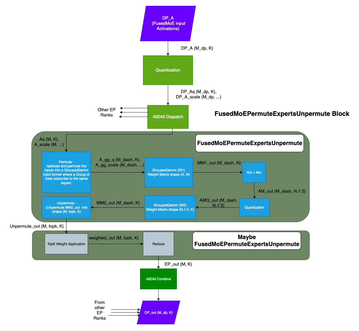 Based on the format of the input activations, FusedMoE implementations are broadly classified into 2 types.